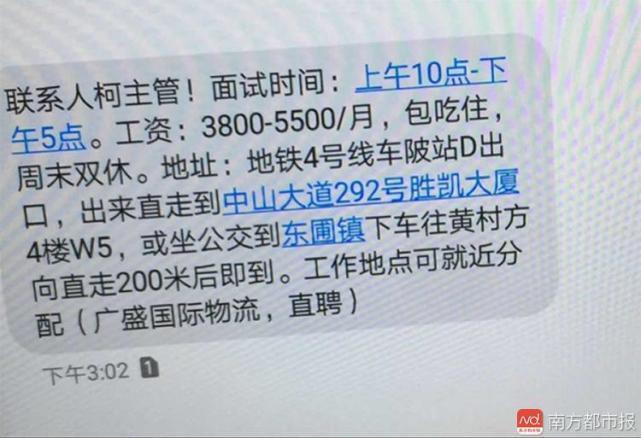 小杨(化名)近日在智联招聘和58同城上投了简历找工作,想应聘办公文员。不久,便有一个人联系她,自称广盛物流的工作人员。并以短信通知面试地点:广州市天河区中山大道中292号胜凯大厦4楼W5房。短信中还说,工资每个月3800-5500,包吃住,周末双休广州抓龙筋按摩,工作地点可就近分配。